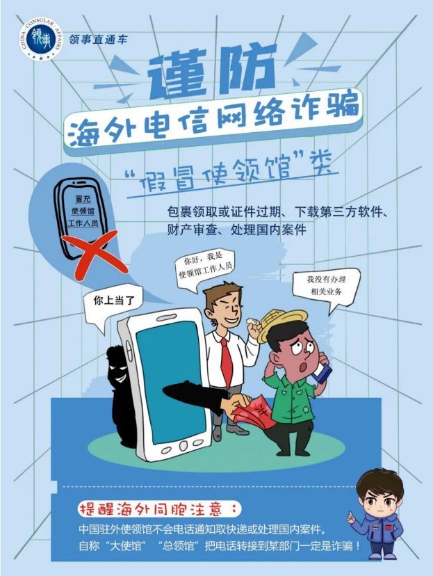 近期,有在韩国中国公民多次向驻韩使馆反映称,接到冒充使馆工作人员的诈骗电话,来电显示电话号码与使馆网站公开电话一致。诈骗分子谎称当事人国内身份信息被盗用,涉嫌违法犯罪,并提供虚假国内“公安机关”电话供当事人核实,所谓“公安机关”人员接电后称情况属实需缴纳“保证金”,诱骗当事人向指定账户汇款。所幸当事人及时识破骗局,未遭受经济损失。