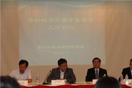 2014年8月8日,来自USC、UCSB、PCC等南加州地区15所高校的中国学联负责人出席了在洛杉矶总领馆召开的留学生安全工作会议。会议由洛杉矶领馆教育组、领侨组和美西南学联共同主办,刘健总领事在会上作了讲话,王雷副总领事、袁东教育参赞、余雄领事等相关人员参加了会议。