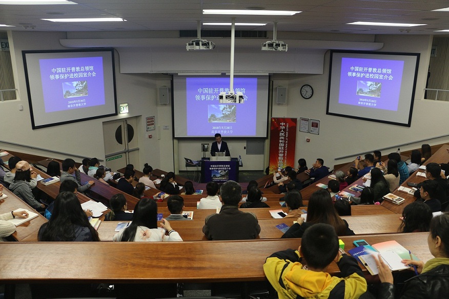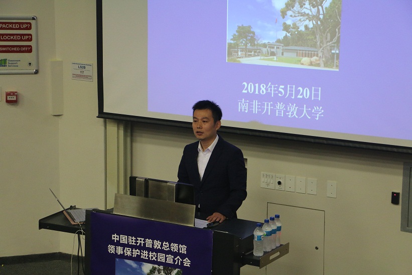 为进一步加强预防性领事保护工作、完善领事保护工作体系,5月20日,中国驻开普敦总领馆赴开普敦大学举办“领事保护进校园”预防性领事保护宣介活动。